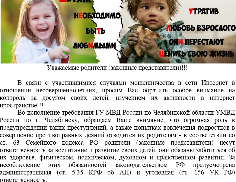При получении информации о лицах неисполняющих свои родительские обязанности ненадлежащим образом просим незамедлительно уведомлять территориального инспектора по делам несовершеннолетних ОУУП и ПДН ОП Ленинский УМВД России по г. Челябинску капитана полиции Бердникову Софью Раисовну +7 (999) 371-18-18, или в полицию по телефону 102.