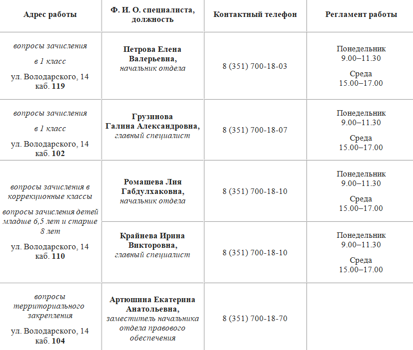 По вопросам приема детей в первый класс вы можете получить консультацию у специалистов Комитета по делам образования города Челябинска (ул. Володарского, 14):